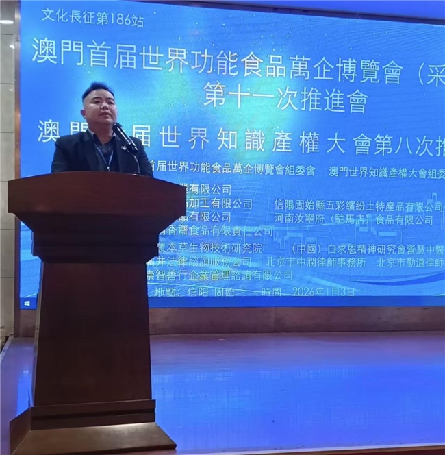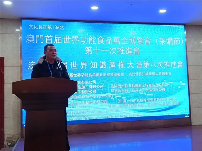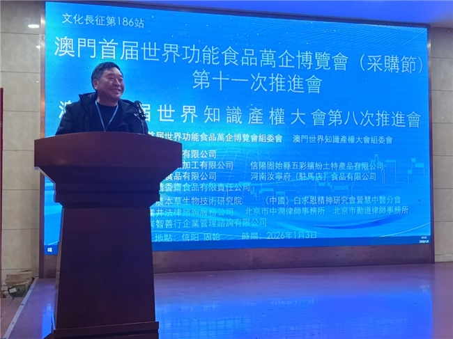 2026年1月3日文化长征第186站、澳门首届世界功能食品万企博览会第十一次推进会、澳门首届世界知识产权大会第八次推进会、河南鋆鑫酒业有限公司新品上市发布会,在河南省信阳市固始县成功举办!